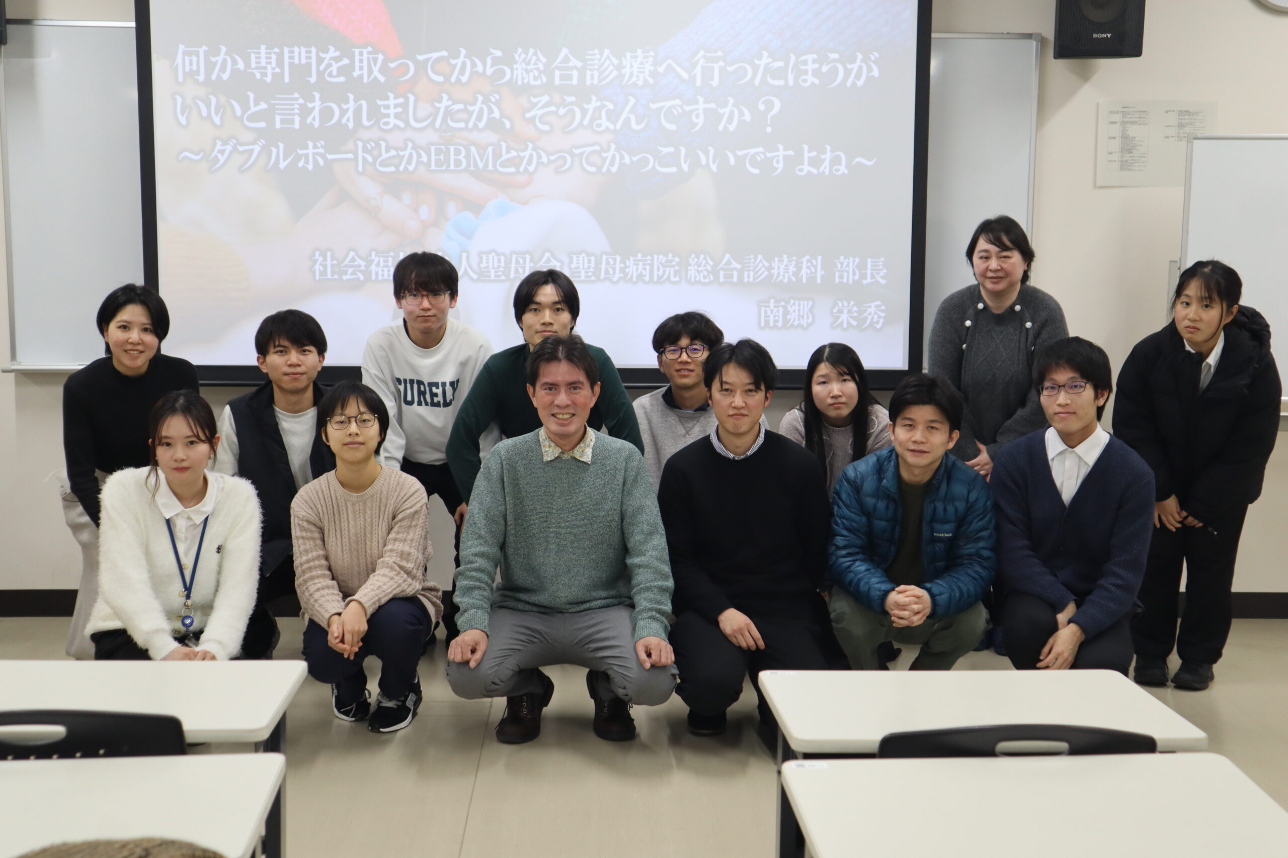 2025年12月26日(金)16時半から「学内で地域医療の体験ができる」課外授業シリーズ2025第五弾を開催しました。テーマを「何か専門を取ってから総合診療へ行ったほうがいいと言われましたが,そうなんですか?~ダブルボードとかEBMとかってカッコいいですよね~」とし、講師には、社旗福祉法人聖母会 聖母病院 総合診療科部長 南郷栄秀先生をお迎えしました。今回参加者は、学生15名、教職員3名、外部から1名で合わせて19名でした。
